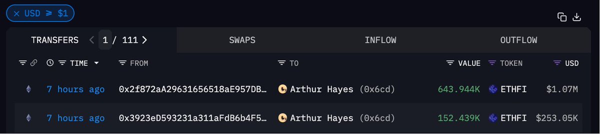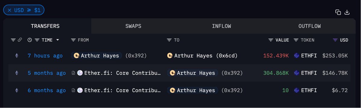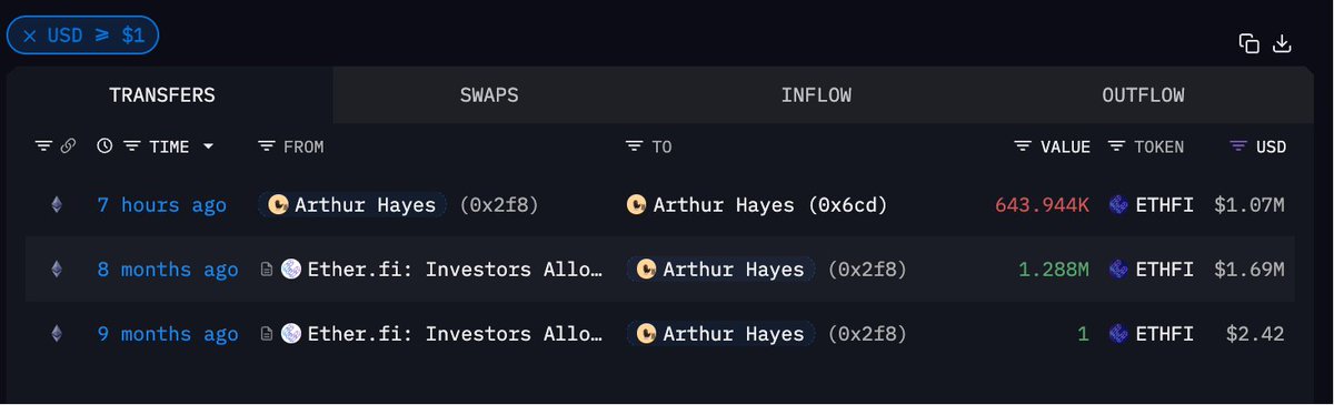 Arthur Hayes 在 7 小时前收到 https://t.co/WkyzgmMNNS 投资人分配地址转移的 79.6 万枚 $ETHFI ,价值 132.2 万美元🤓 两个地址 0x2f8...D699b 和 0x392...0c637 累计从项目方地址处收到了 159.2 万枚代币,但只有一部分转给了老黑,因此归属暂不明确 他目前共持有 201.3 万枚 ETHFI,总价值 328 万美元,是链上 TOP5 资产;钱包地址 https://t.co/yalHhrGOYk