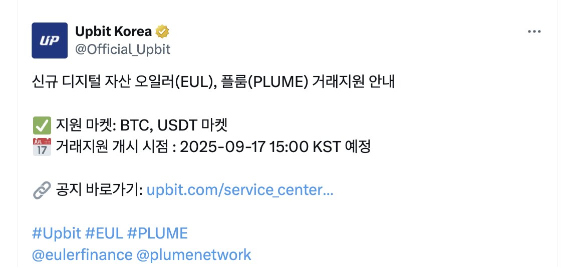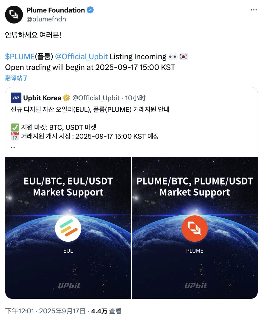 今天 $PLUME 正式上线韩国最大交易所之一 Upbit。