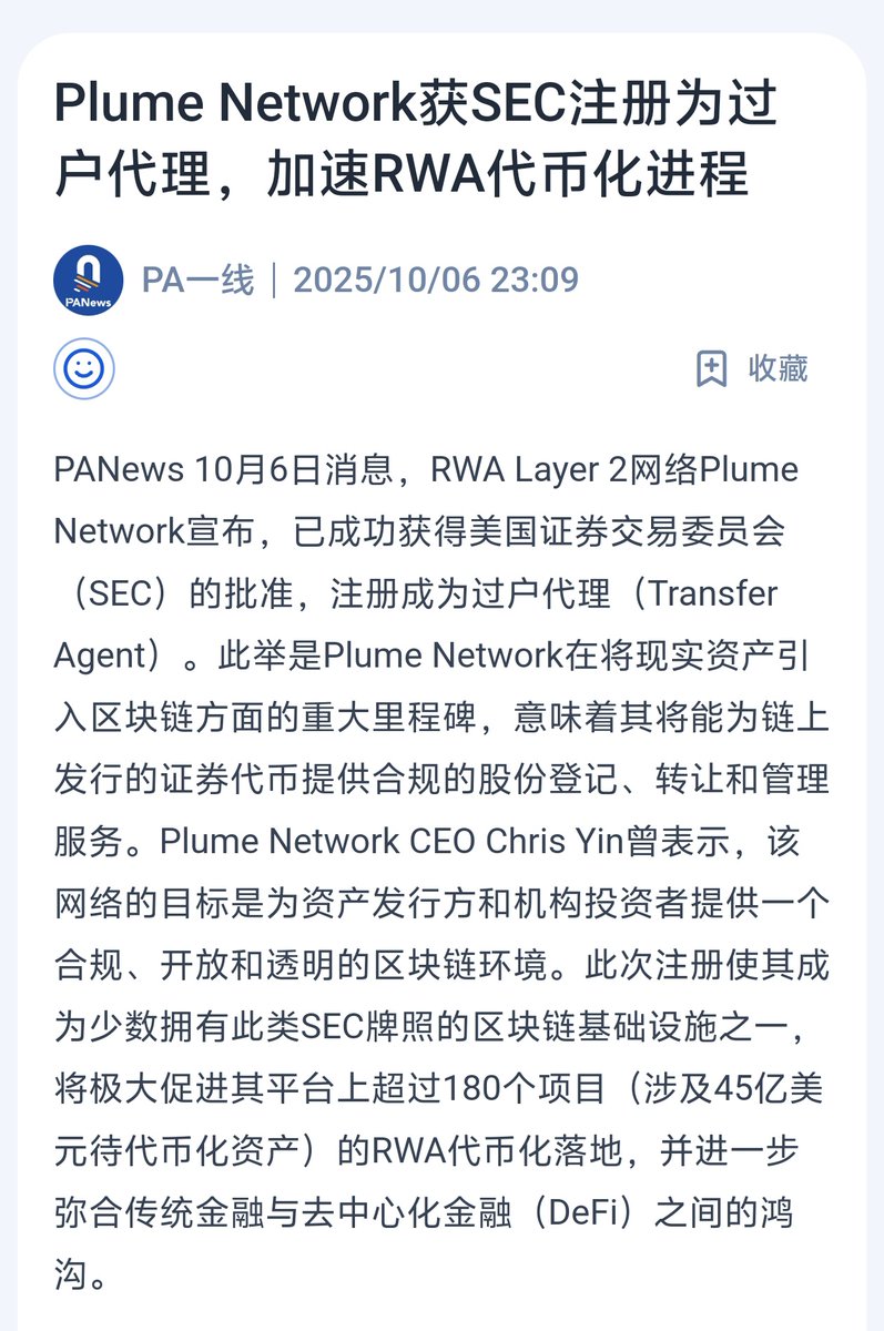 原来是Plume 获得的SEC 批准成为注册转让代理(Transfer Agent)资格,这一利好长久影响是史诗级得