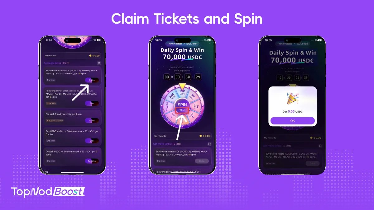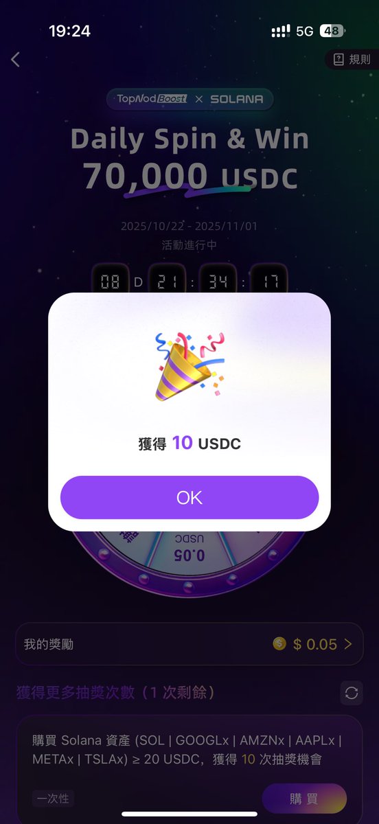 4)单笔买入 ≥ 20 美金 Solana 资产(SOL | USDT | GOOGLx | AMZNx | AAPLx | METAx | TSLAx)可获得10张抽奖卷,每天可完成1次
