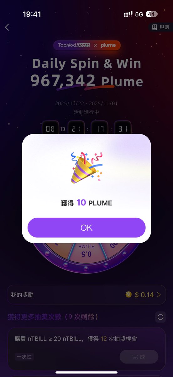 3)再次单笔买入 ≥ 20 美金 Plume Nest nTBILL可获得 2 张抽奖卷,,每天可完成1次