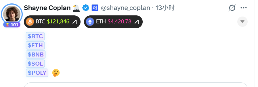 昨晚,创始人 @shayne_coplan 壮志凌云,首次发帖抛出 $POLY 代币符号,我们 100% 确定一定会发币了,以前他都是默默点赞,这次爆炸头不装了,直接开大!