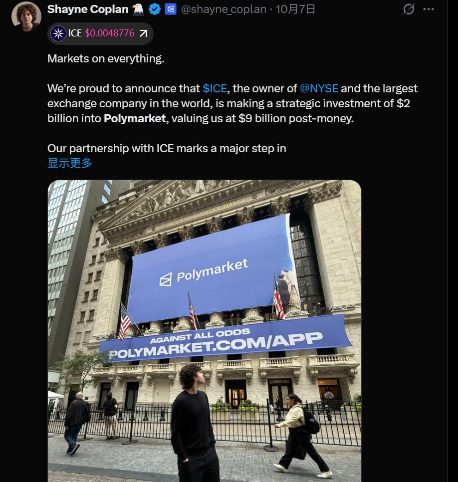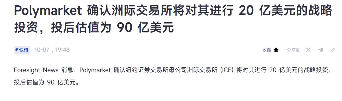 Polymarket 目前已经确认纽约证券交易所母公司洲际交易所 (ICE) 将对其进行 20 亿美元的战略投资,投后估值为 90 亿美元,这是真的牛逼天王级的背书