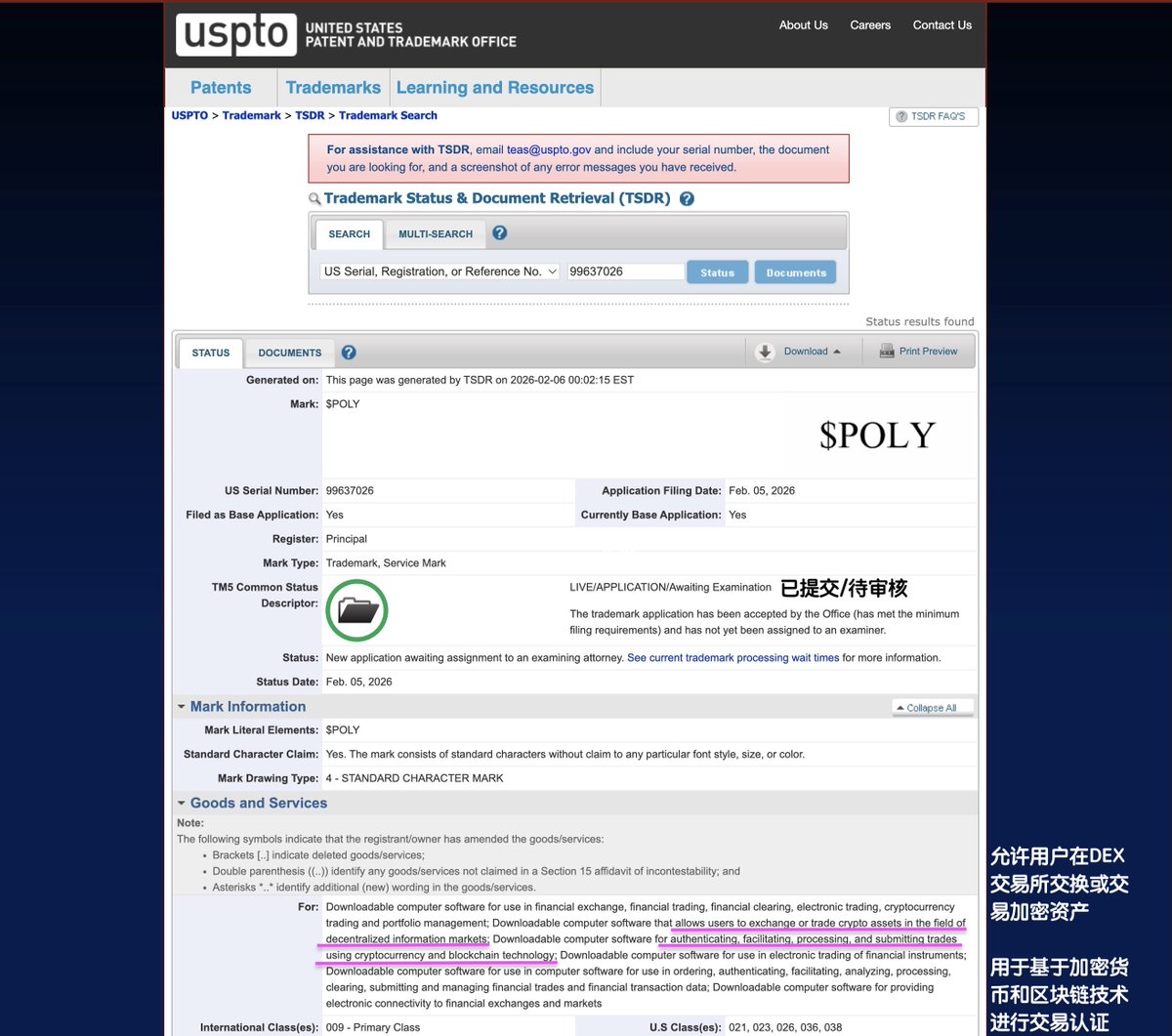 Polymarket 的母公司 Blockratize Inc. 已正式提交 POLY 和 $POLY 的美国商标申请。