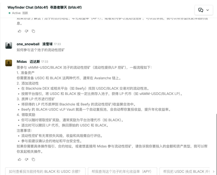 2, 和雪崩链AVAX合作,完成AI集成;Wayfinder AI 的代理(包括 Midas 用于交易和 Vulcan 用于合约,以及未来的其他代理)现可在 Avalanche 网络上执行多种操作,例如交换(swap)、桥接(bridge)、跳转(hop)、质押(stake)、借贷(lend)以及创建智能合约(smart contracts)。