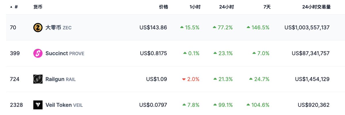 Naval 喊单 $ZEC 以来累计上涨近3倍—— 目前价格接近 230,超越了 $Sol 的价格! 恰逢前段时间 ETH 基金会成立专注隐私赛道的团队,宣布“隐私”应成为以太坊生态系统的核心特性,隐私这块算是彻底爆发: 上周让大家关注的其他隐私相关项目比如: $RAIL 和 $PROVE 都有不同程度的上涨!