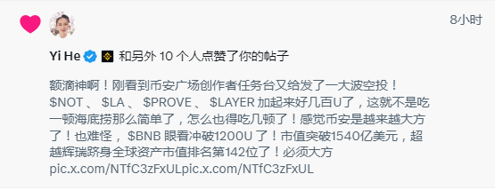 额滴神啊!刚看到币安广场创作者任务台又给发了一大波空投! $NOT 、 $LA 、 $PROVE 、 $LAYER 加起来好几百U了,这就不是吃一顿海底捞那么简单了,怎么也得吃几顿了!感觉币安是越来越大方了!也难怪, $BNB 眼看冲破1200U 了!市值突破1540亿美元,超越辉瑞跻身全球资产市值排名第142位了!必须大方