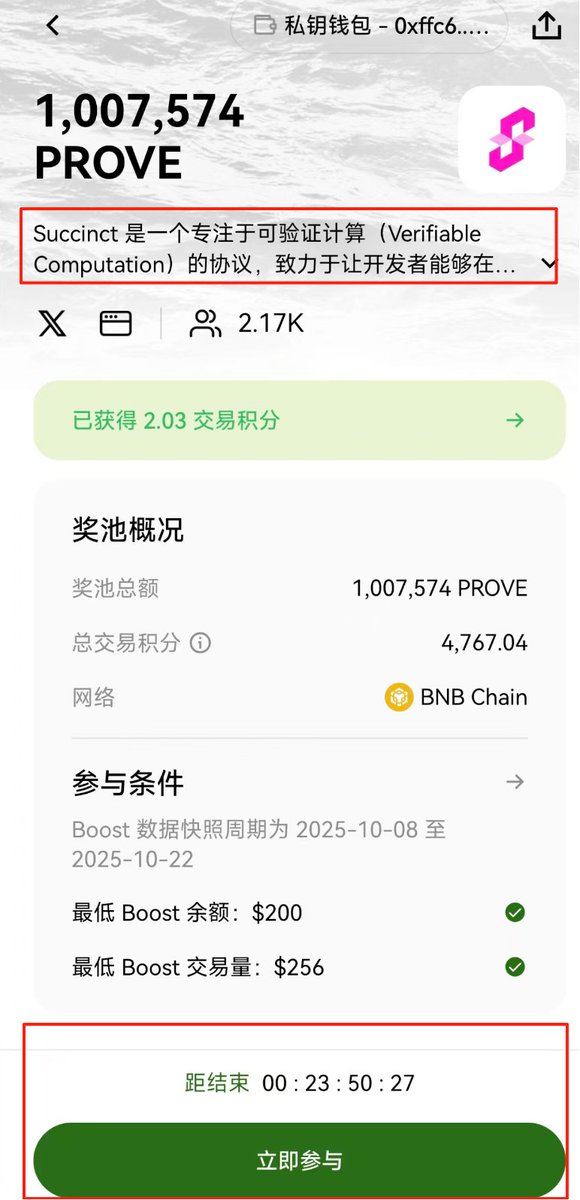 OKX Boost又来一期,速度参与💥 停不下来,又来了一个项目 这次项目是 @SuccinctLabs 100万枚 $PROVE 24小时内点一下参与按钮就可以 看来OKX Boost低保领钱还是很稳的,保持正常交易就行 没绑定OKX DEX的绑定下 https://t.co/San12H4fnT 永久减免20%手续费 邀请码54321 @okx @star_okx