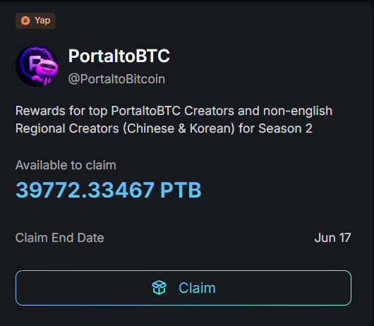 刚发现 @PortaltoBitcoin 的第二季 yap 奖励可以领了,我总共有4W 个 $PTB 左右,目前只能领取 1/3 ,大家有写过文章的可以去看看
