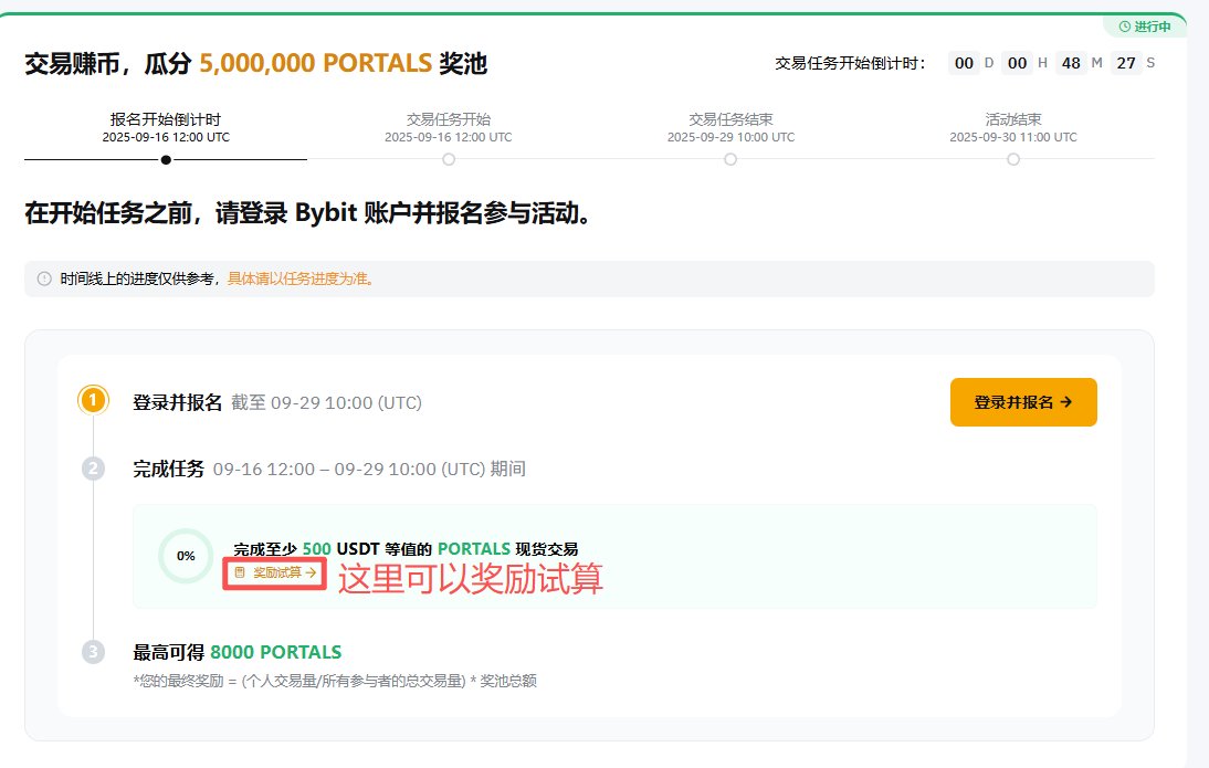 老用户:交易赚币,完成500U等值的 $PORTALS 现货交易。就可以分5M的 $PORTALS 奖池。左下角那里是可以试算奖励的