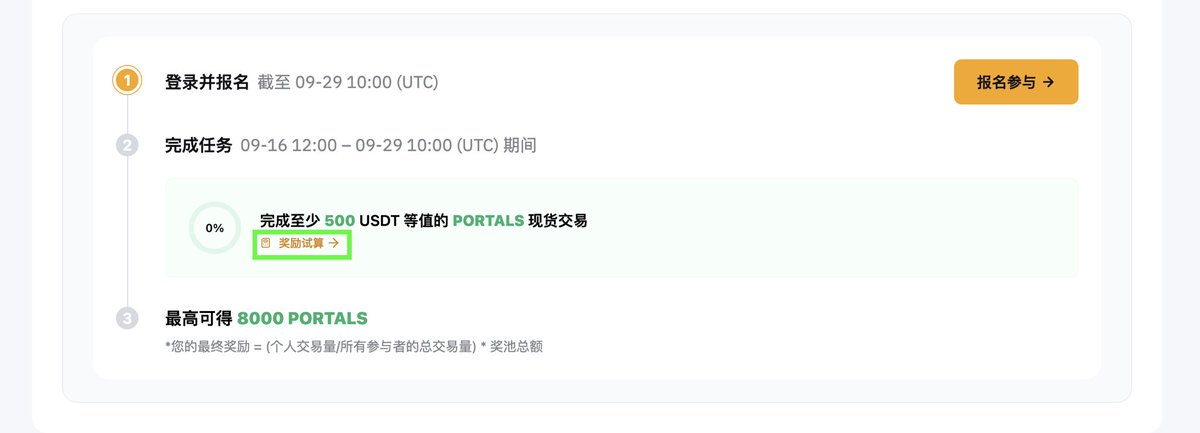 ➤新老用户交易:500万枚奖励,在页面报名之后,**在活动期间完成 ≥500 USDT 等值 $PORTALS 现货交易即可参与。奖励按交易量比例瓜分,交易越多,奖励越多。每个账户最多可获得 8000 枚 $PORTALS。另外页面内有「奖励试算器」,输入交易金额即可预估能拿多少,能及时查询奖励预估。