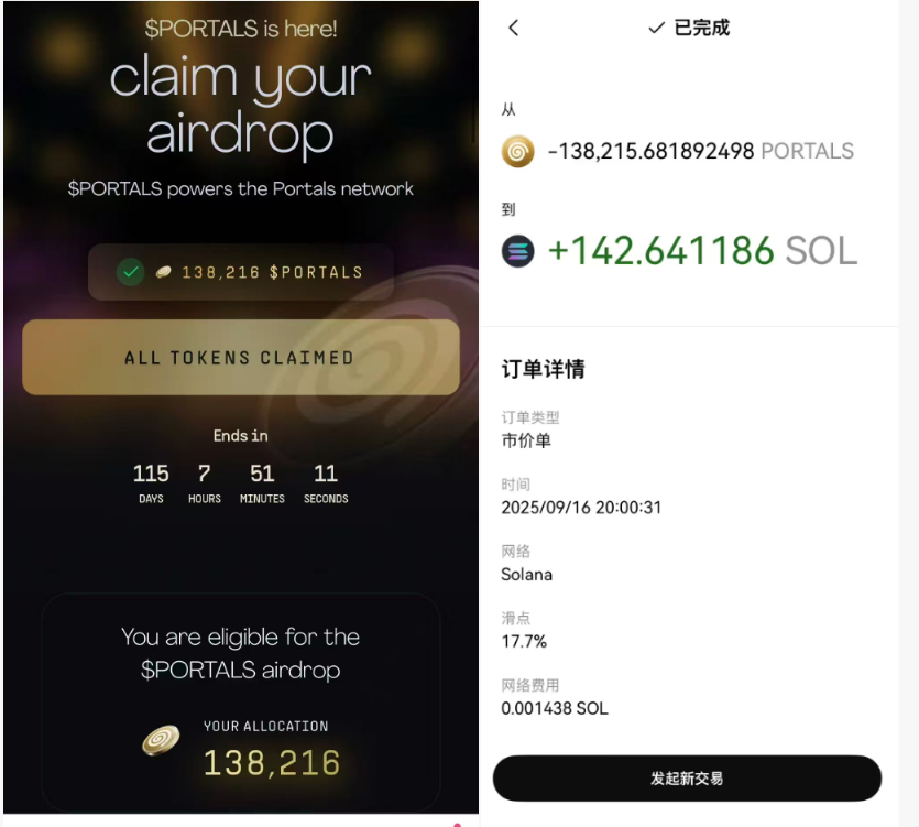 上午刷到有人晒 @_portals_ 空投收益,单号13.8万枚 $PORTALS ,换了142.6枚SOL,折合3.3万U,真尼玛牛逼。我一个没有,看你们发财。