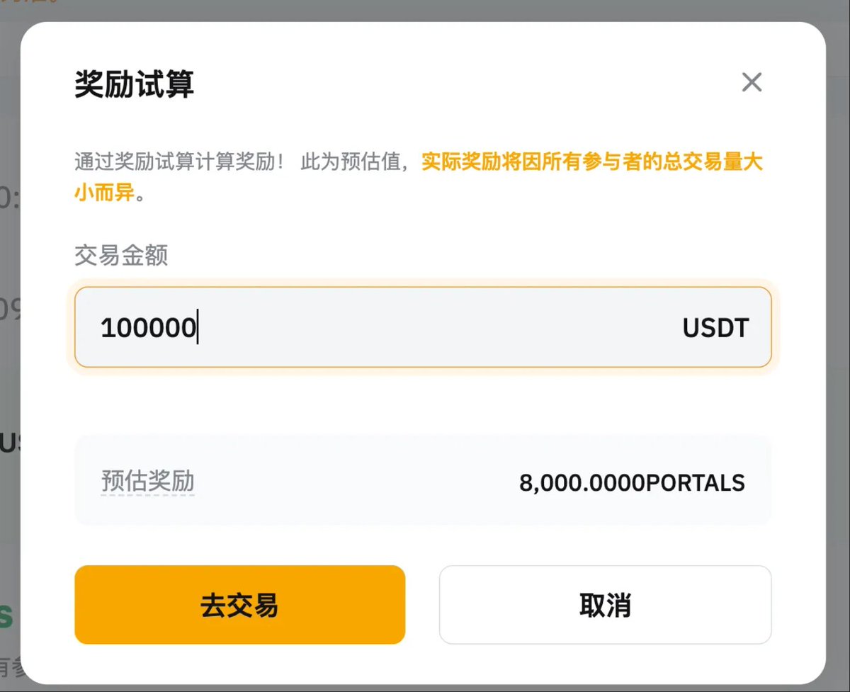 2️⃣ 老用户交易奖励:基础门槛是交易 500U,交易越多奖励占比越高,活动页面有个「奖励试算器」 可以看到交易金额对应的预估奖励,比如交易 10 万刀对应 8000 PORTALS 奖励