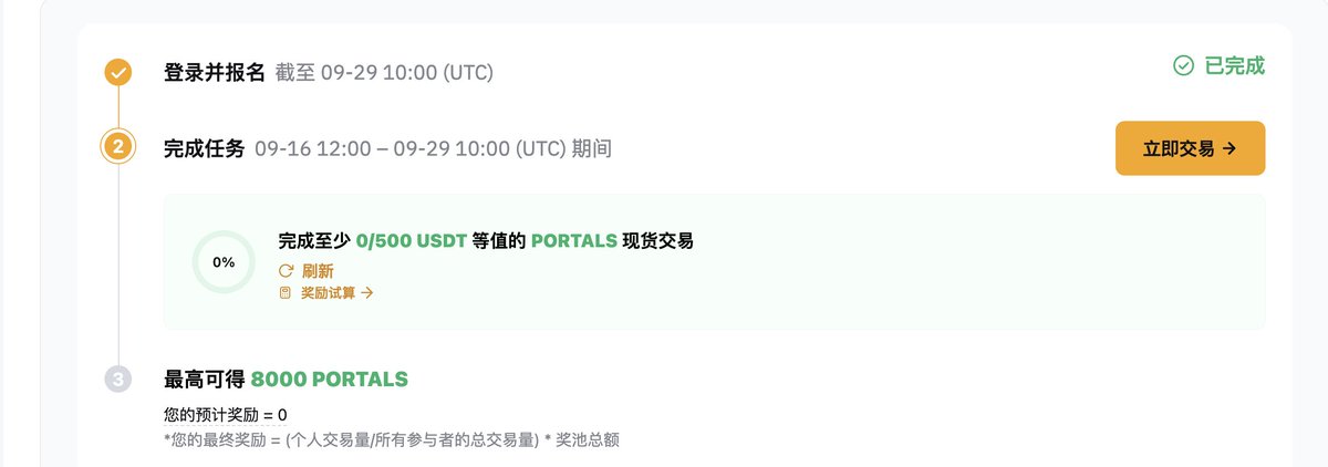 ➤新用户专属:600万枚奖励,完成注册之后在页面报名,累计充值 ≥1000 枚 $PORTALS,或者充值 100 USDT 并交易 100 USDT 等值的 $PORTALS,奖励仅限 前 1 万名,大约单体个人是600个,价值120美金,拼速度!