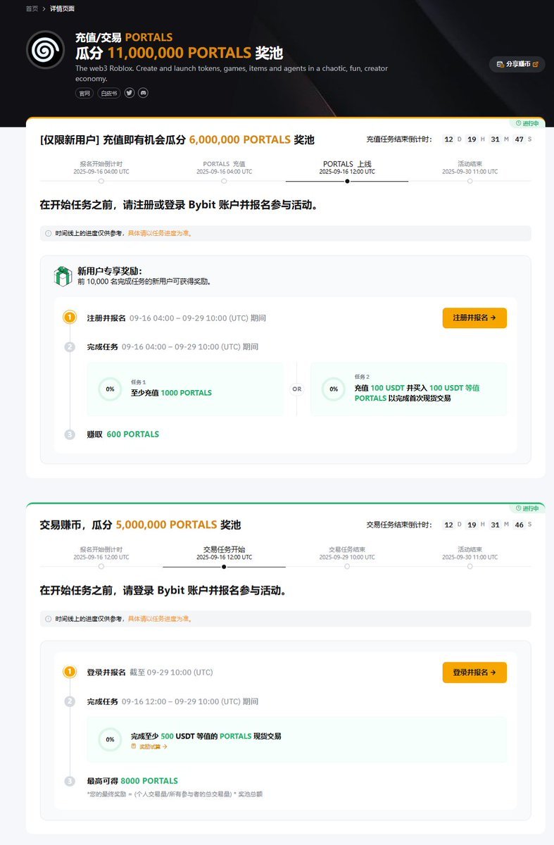 如果你跟我一样踏空,可以去撸 @Bybit_Official 活动。他们家为了拉新真是拼了,前脚刚拿出320万枚ZKC,后脚又奖励1100万 $PORTALS ,规则都一样,一部分针对新用户,一部分用于交易挖矿,有精力的去撸。