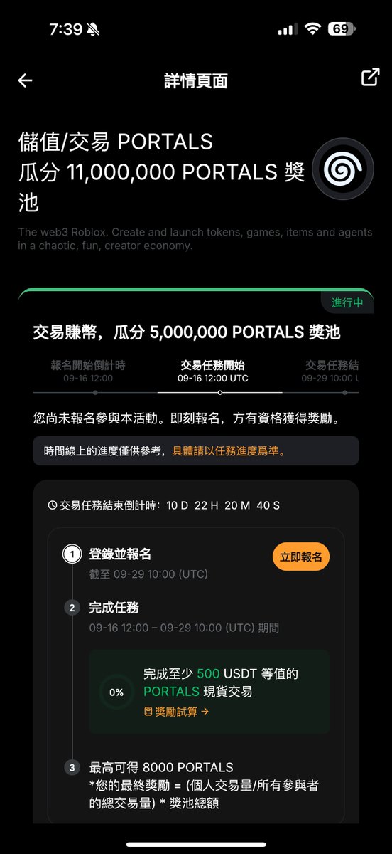 ◎新用户注册+交易:新用户注册后在 Token Splash 页面点击报名,然后充值不低于 1000 枚 $PORTALS 或者充值 100 USDT 并买入 100 USDT 等值的 $PORTALS 就可以了。前 1 万名新用户每人 600 枚 $PORTALS 奖励,现在价值 $144 刀。