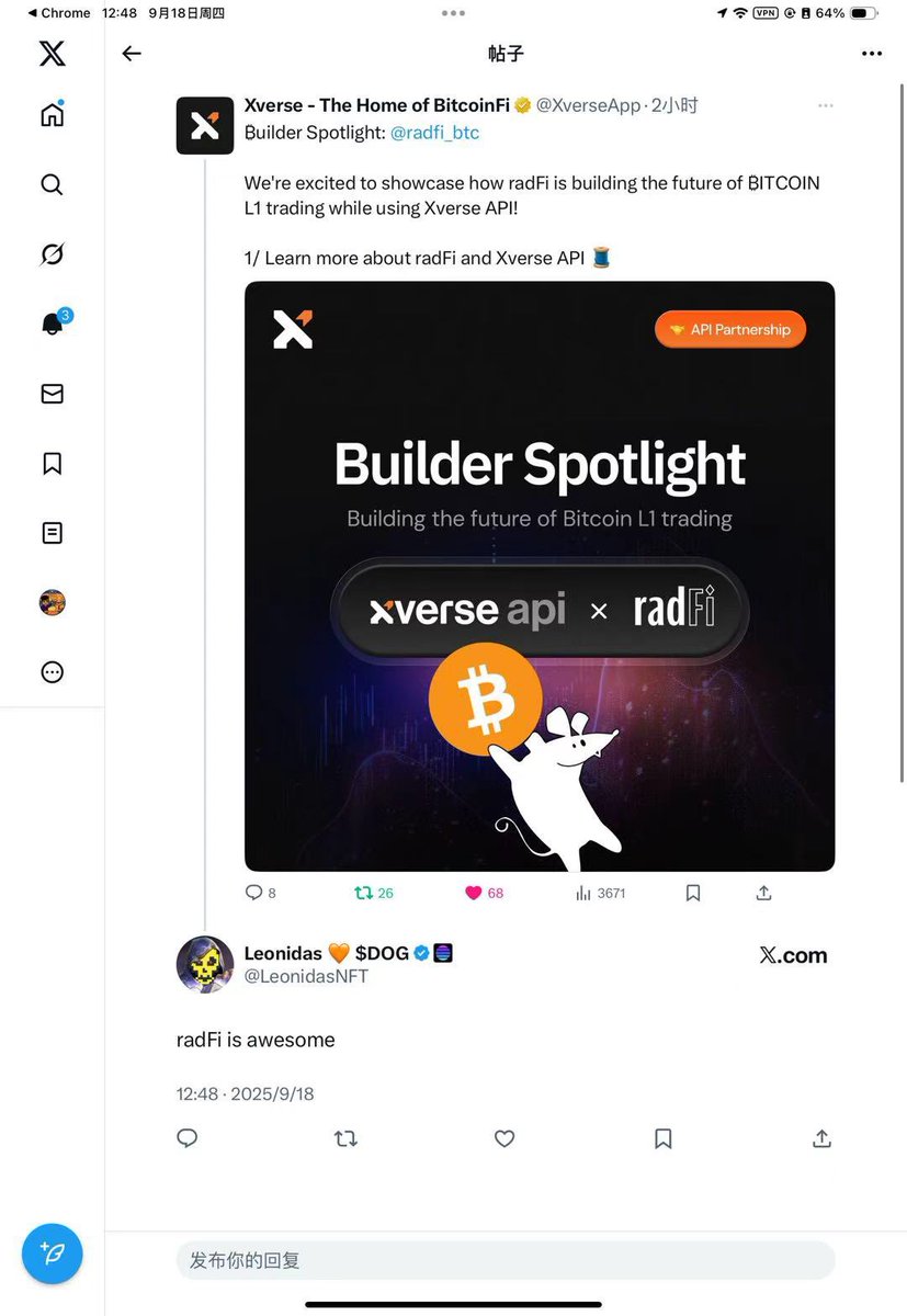 😄符石和符文 $dog 创始人Leo @LeonidasNFT 及比特币生态常用钱包Xverse @XverseApp 对RadFi再次表示认可!