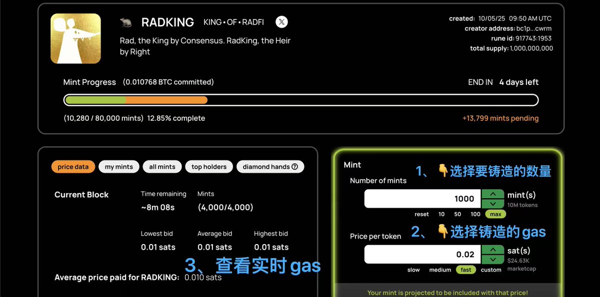 铸造过程是和大饼区块同步的, $radking 和 $rad 一样总量都是1B,gas越高先到先得。