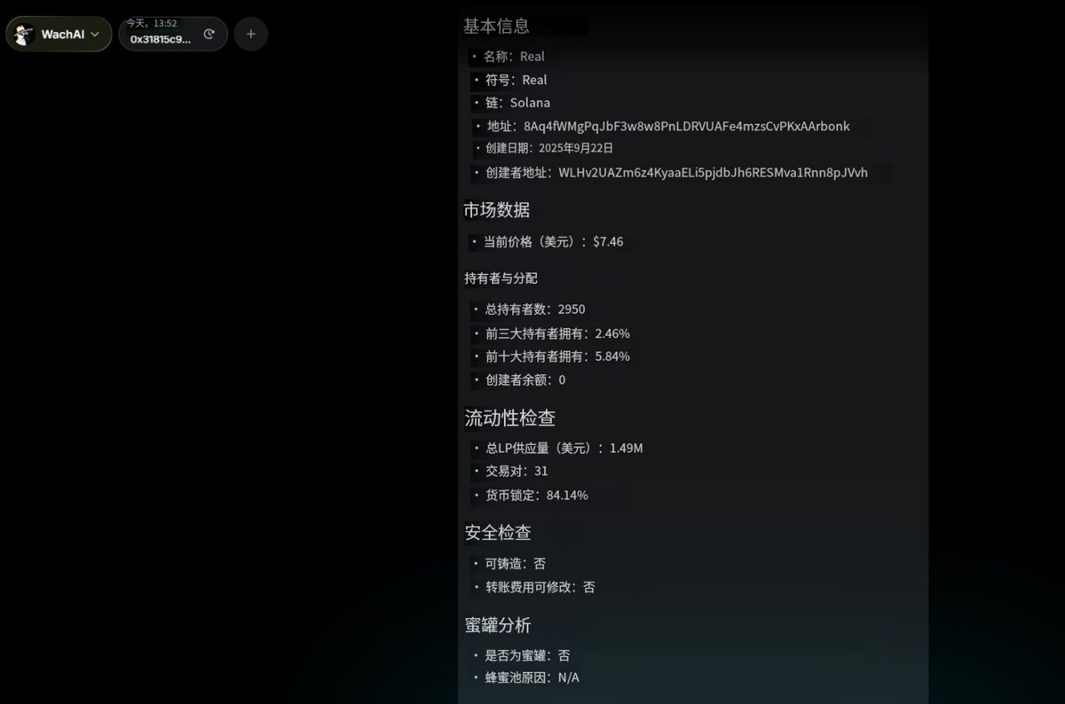 昨天 SOL 链出了个速通 220 M 的大金狗 $REAL ,有不少人赚麻了。 但也有不少人亏麻了,因为高点下来跌了 45%。 很多人在不了解代币合约地址数据情况下,盲目购买导致亏损惨重。 刚看到 Warden Protocol 上线了一个很有意思的 Agent 「WachAI」,功能就是分析代币合约地址。 🔻🔻🔻 使用方法很简单,只需要把合约地址发送给 WachAI, 几秒钟内就会出具一份代币合约地址报告,会检测以下几项数据: ※ 持有者分布和集中风险 ※ 流动性安全性和锁定状态 ※ 合约权限和铸币能力 ※ 诱饵检测和卖出限制 ※ 实时市场数据和交易对 我体验了下,查了 $REAL 的合约地址,大概 3 秒钟就出具了一份报告,如下: 重要的数据一目了然,唯一不友好的就是目前只有英文版,中文据说官方后面会上线。 买新币之前用 Warden 的 Agent 查一下还挺方便,而且使用还能获得 PUMP 积分,在参与 Warden 空投活动的别错过。 Warden 第三季空投活动还有不到一周就要结束了,进入冲刺阶段了,还没参与的赶个末班车也不错。 #KaitoYap @KaitoAI @wardenprotocol #Yap $WARD