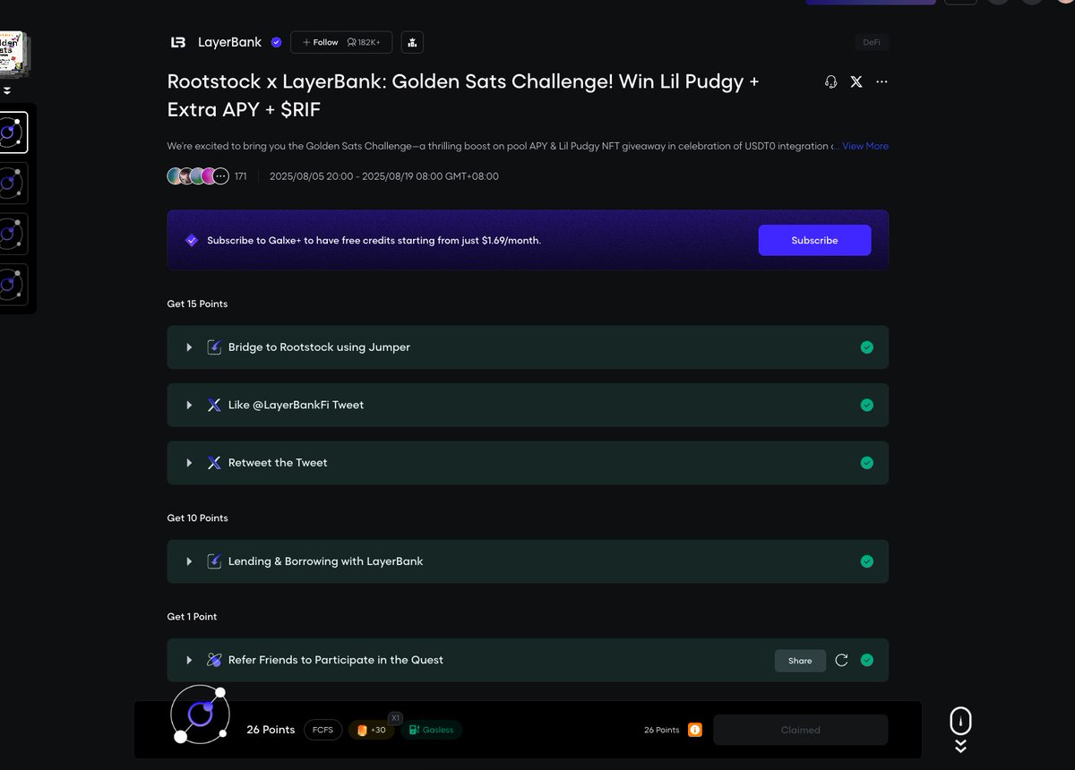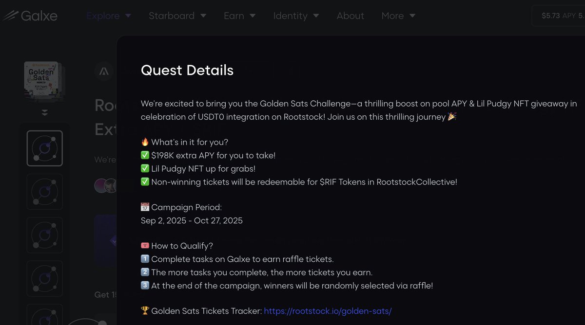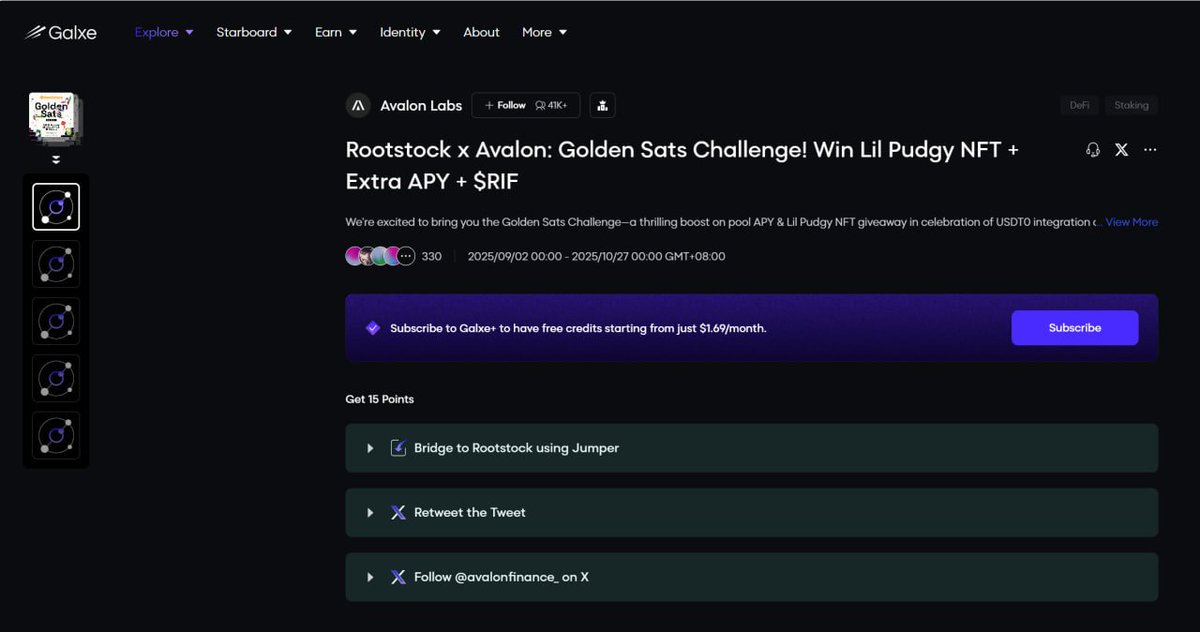 Rootstock 跟 Avalo 在银河搞的 Golden Sats 活动,奖池是 19.8wu 的 apy 年化 + Lil Pudgy nft