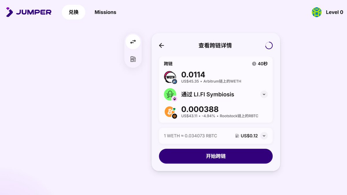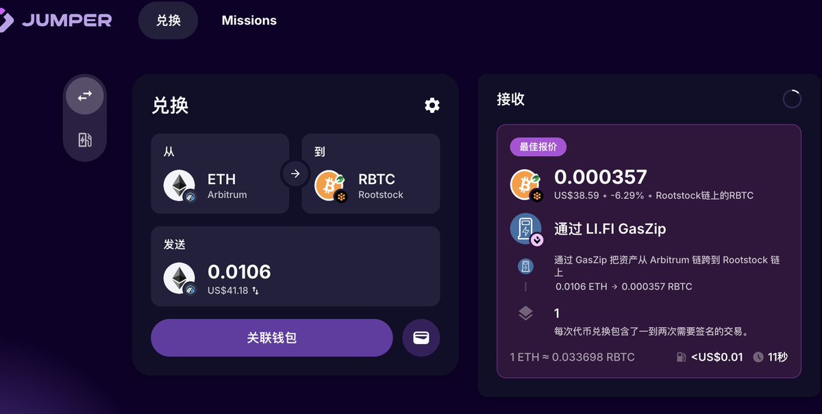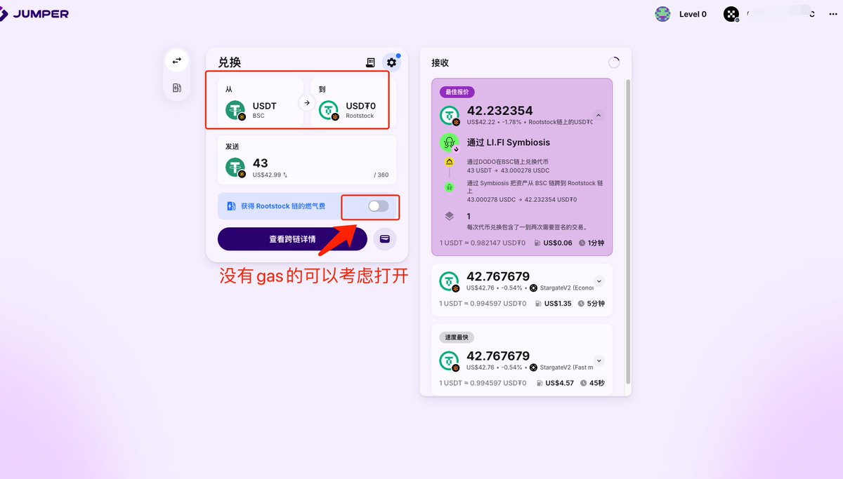 2️⃣在 jumper Swap>40u到 RBTC/USDT0/WETH ,建议从 gas 低的 L2 过去