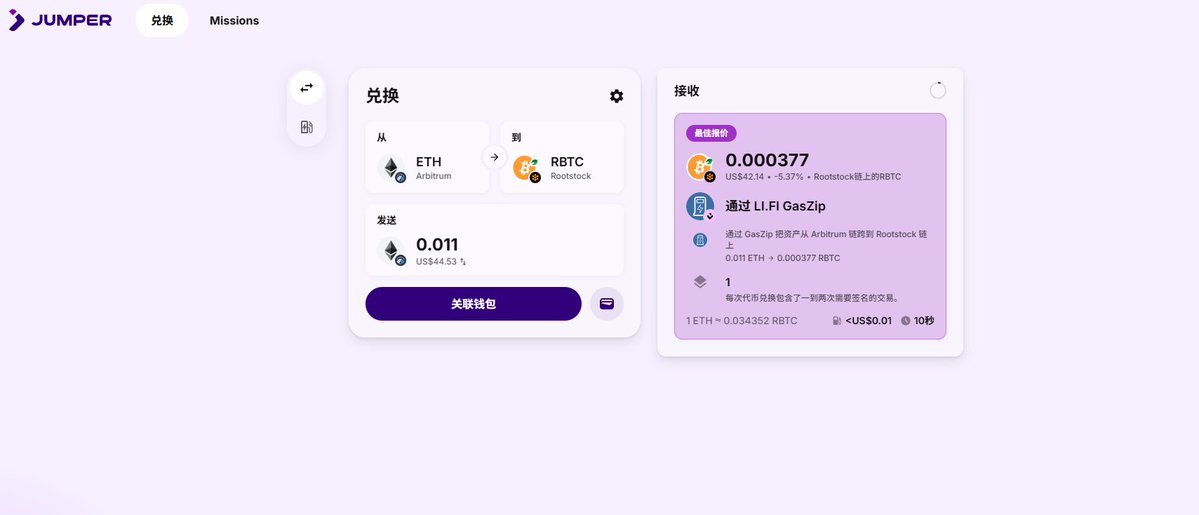 1、使用 Jumper 跨链桥从 @arbitrum 把资产桥接到 rootstock 网络上(支持的资产有 USDT0,RBTC 以及 WETH),桥接 $40 以上可以拿满 3张抽奖券