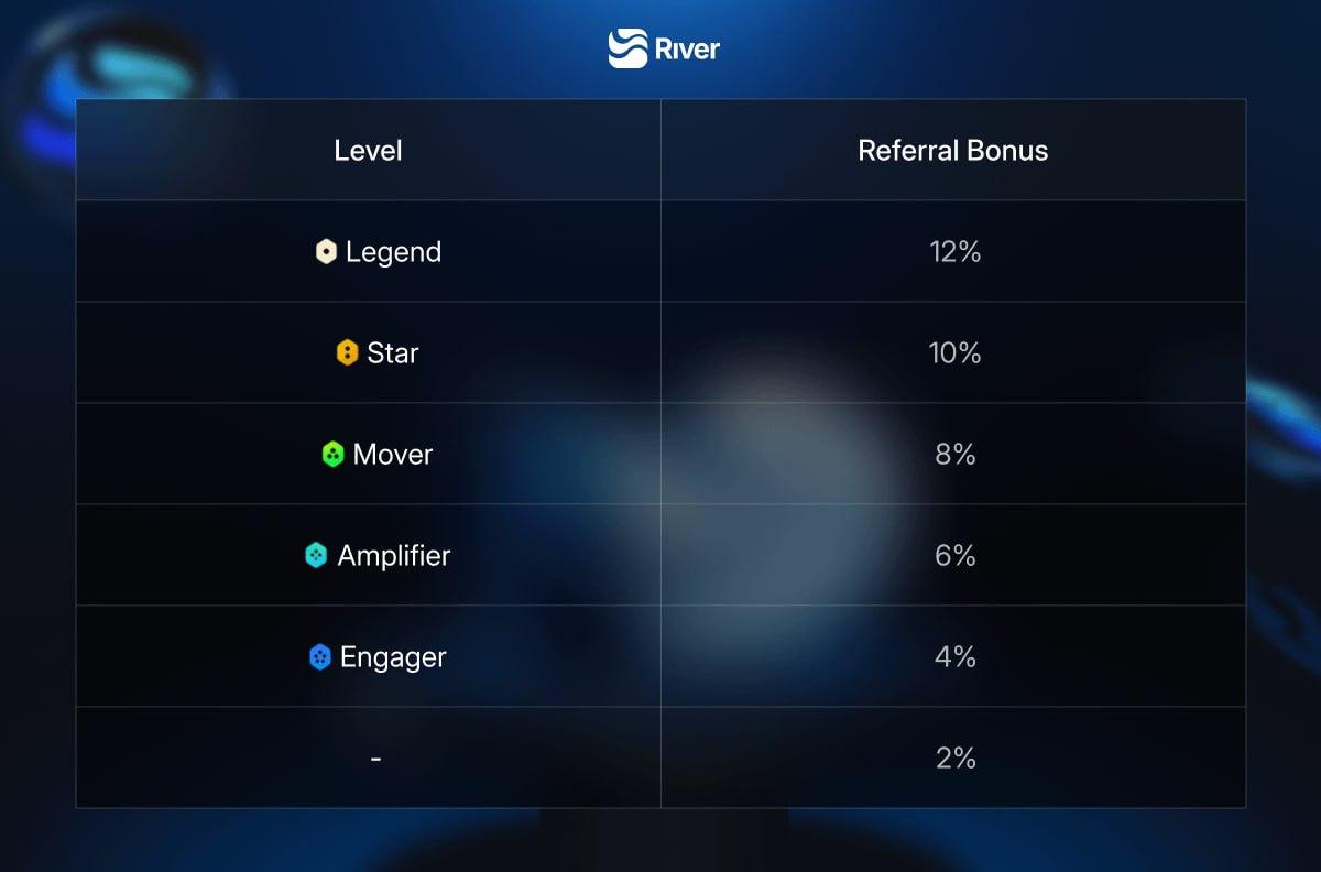 此外,River还推出了推荐奖励计划,每位参与者可以分享自己的推荐码(X用户名),从而获得2%-12%的额外River Pts奖励。