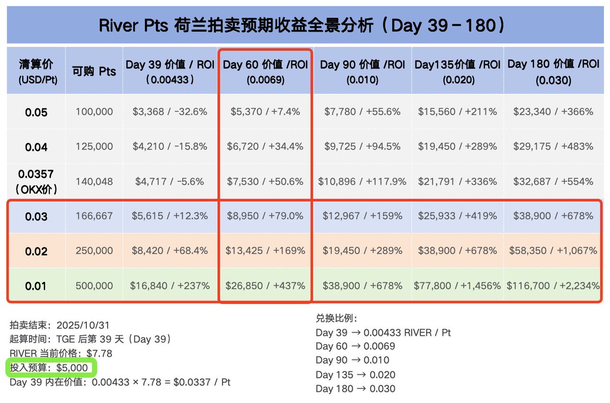 按照现在 $RIVER 7.78价格计算,如果你能在荷兰拍卖中以 $0.03–$0.0357 区间成交,那么在 Day 39 几乎不亏,Day 60 起获利翻倍,Day 180 预计 ROI +550%~+678%,你的 $5,000 投资有望升至 $32,000–$39,000+。