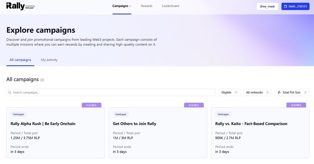 Rally @RallyOnChain 注册绑定推特即可获得初始积分,然后官方的平台上线了,现在可以写文章贡献赚取 $RLP 代币奖励,Rally 使用 AI 验证器(基于 GenLayer 构建)对每篇帖子进行评分,第一个周期3天内就结束,想参与的可以抓紧搞一下!