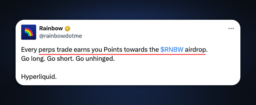 提醒:彩虹钱包已确认其代币 $RNBW 将于2025年第四季度推出。此次更新似乎是赚取积分的最佳机会之一,同时也为Hyperliquid的第二次空投做好准备。
