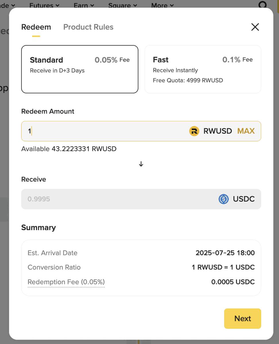 支持快速赎回(秒到账)或标准赎回(T+3),每天还有 5000 RWUSD 免费快速赎回额度,流动性极强。而且还支持作为币安 VIP 借币的抵押资产,能一边赚利息,一边操作仓位,效率拉满!