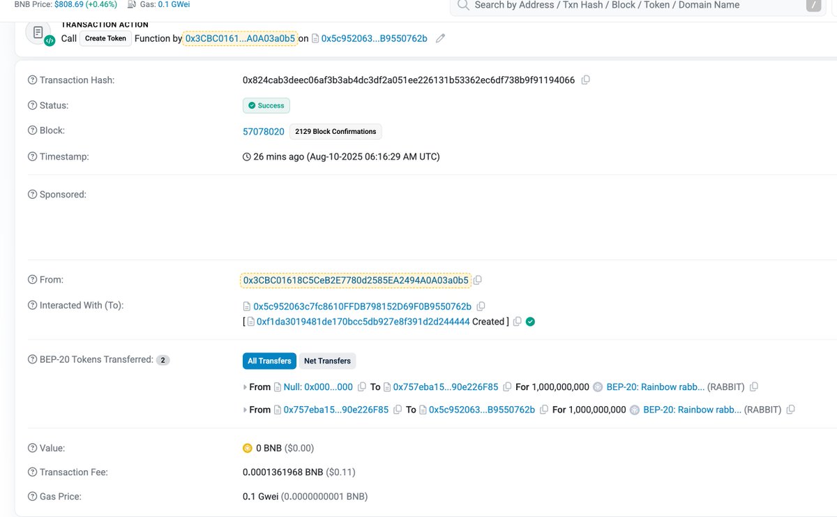 看链上好像没问题哎,这貌似真的是 @Bullbitai 那个演示钱包刚刚部署在four上的代币 $RABBIT