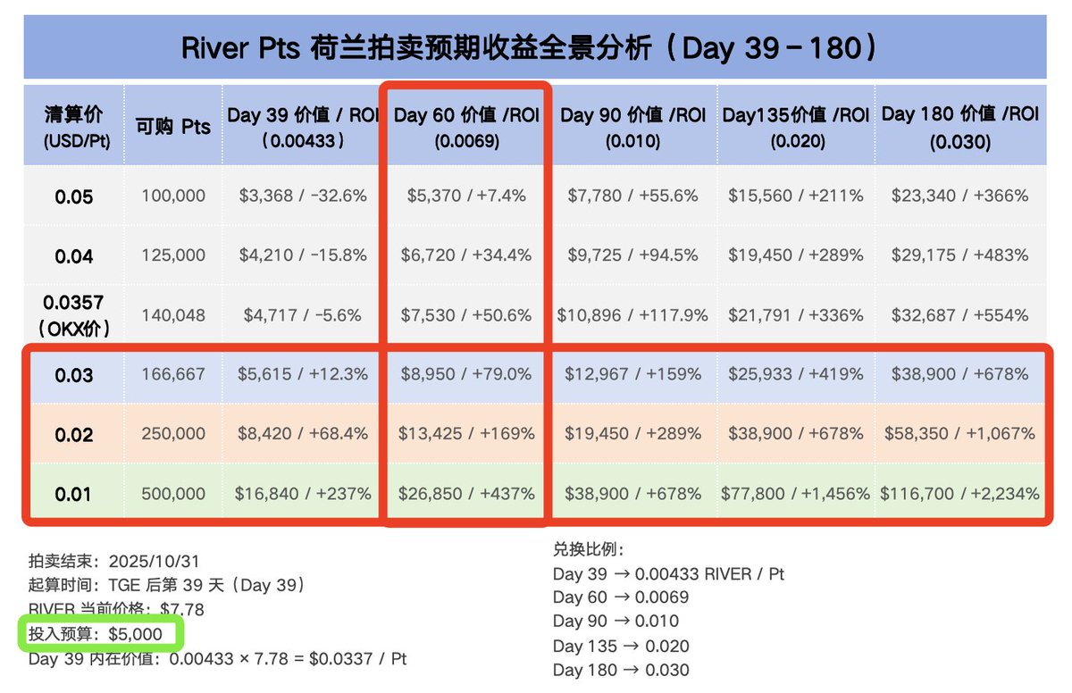 经过测算,如果拿 $5000参与公售,在 $River 价格不变的情况下,River Pts公售清算价在$0.03,是可以【即拍即赚】。