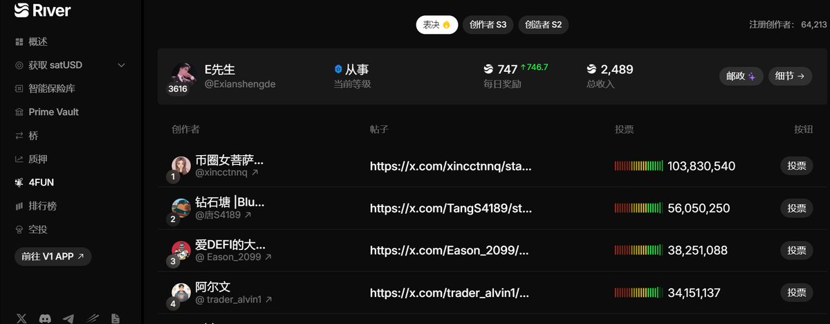 最近 @River4fun 真的出圈了, @RiverdotInc 上期的投票活动结束没多久,又搞了新一轮的投票活动,Vote4Creators 潜力新人榜活动
