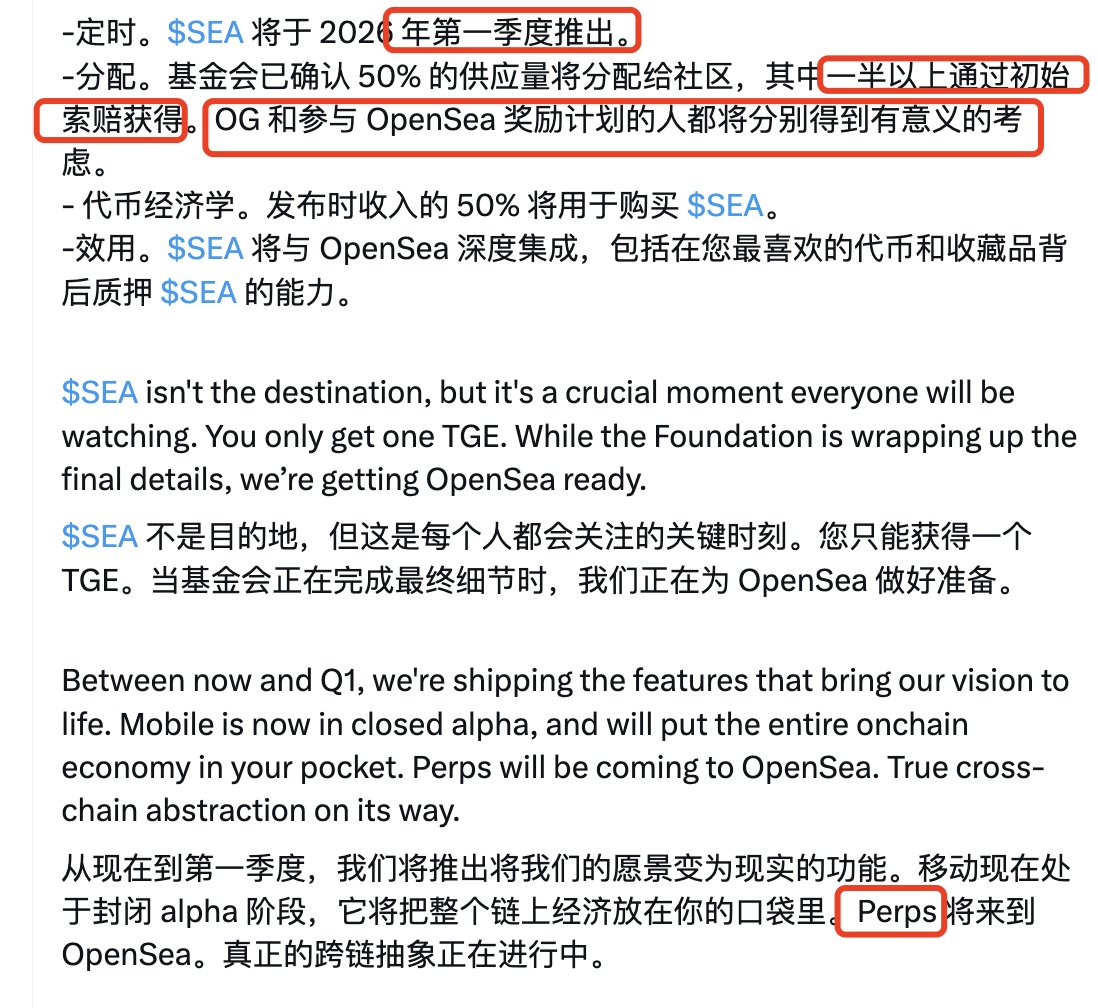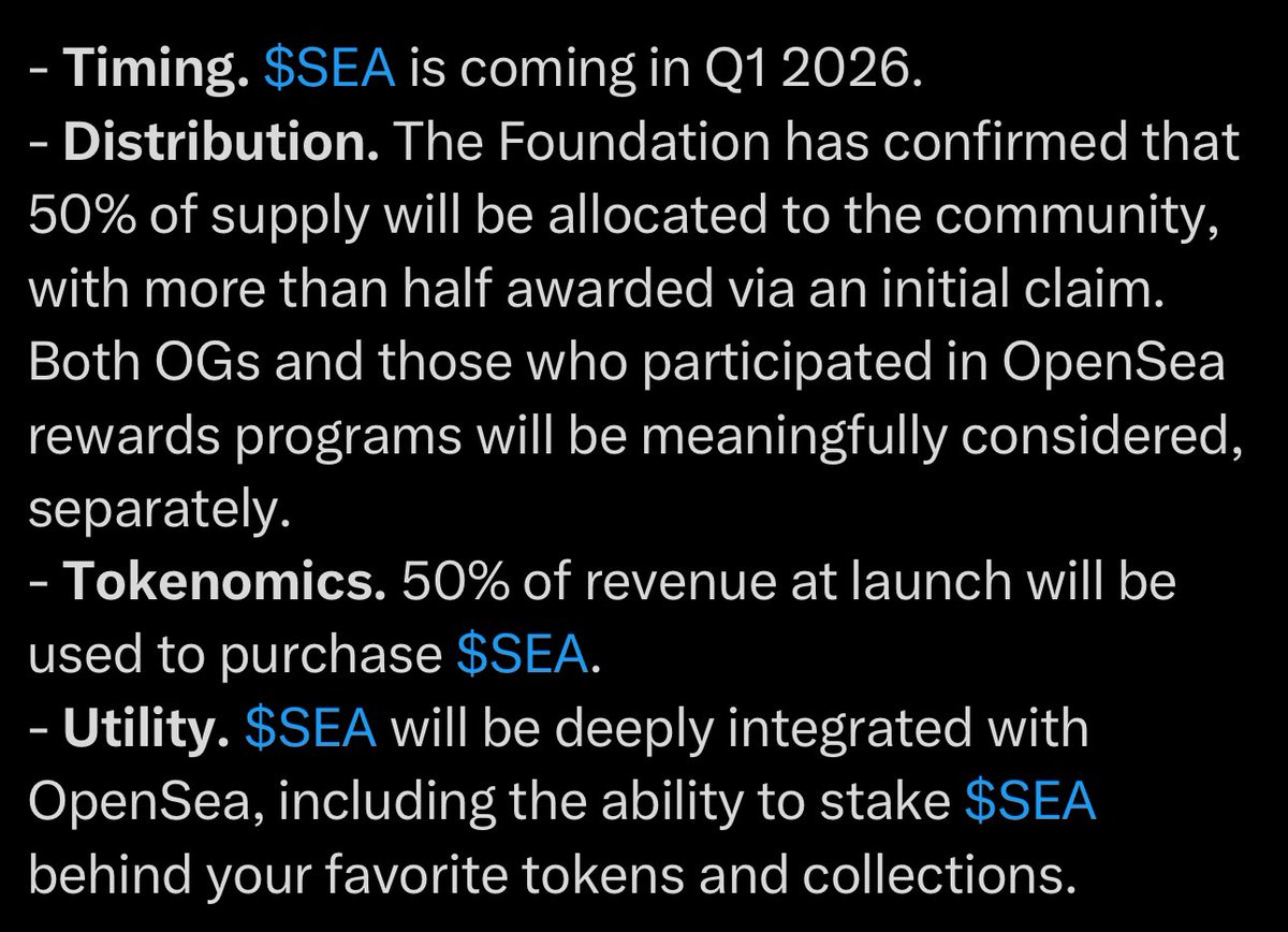 ⚡️终于要来了, @opensea 平台币 $SEA 确认将于2026年Q1上线——