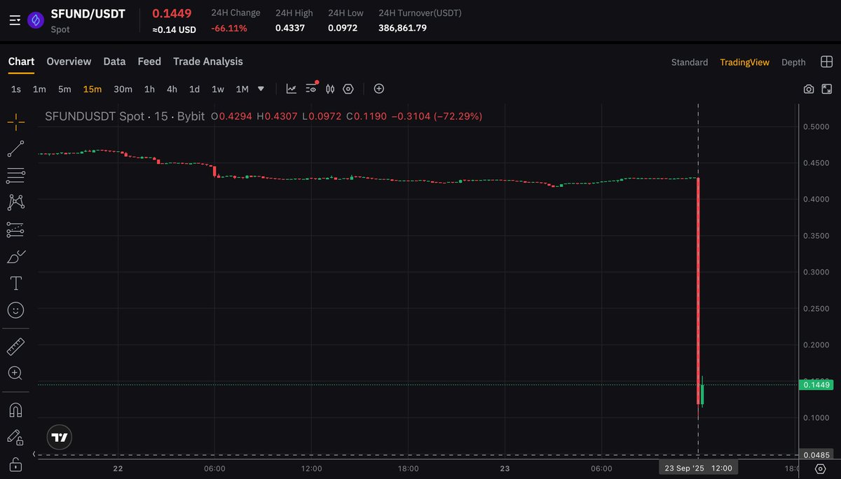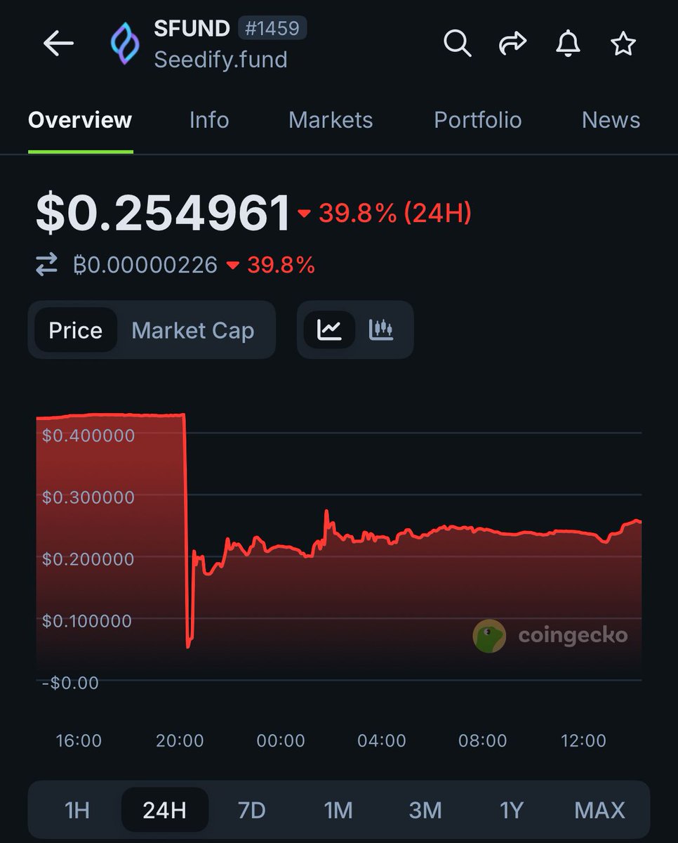 @SeedifyFund 的 $SFUND ,42m 美金的 FDV 在一秒内跌到 6m 美金,这个币目前上过最大的 CEX 是 Bybit,暴跌原因未知,官方没有任何声明,也还没有任何媒体报道。