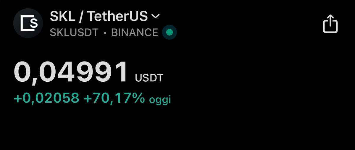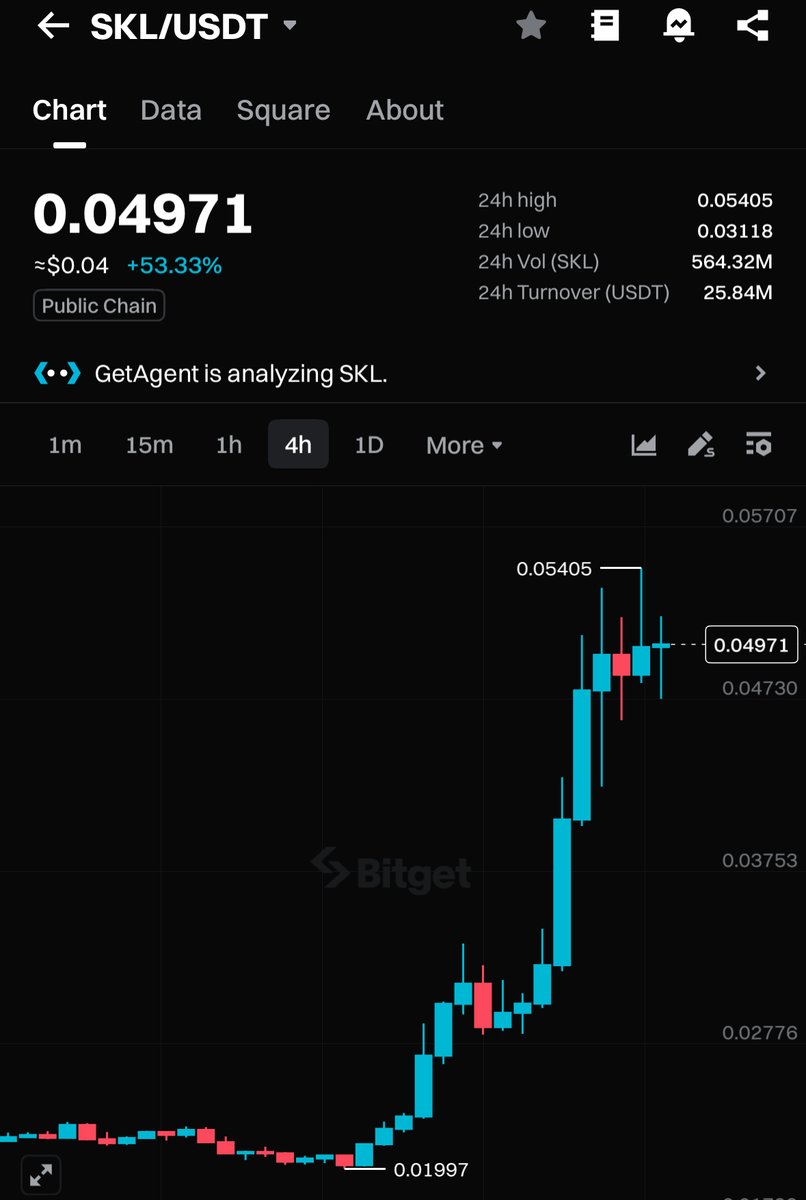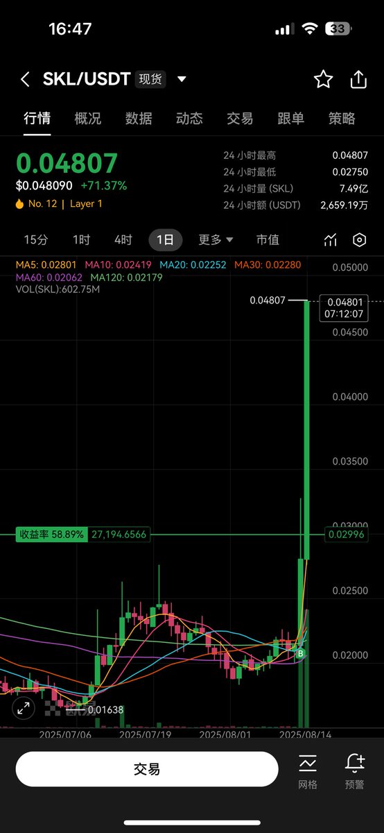 $SKL 是 ERC-777 代币,截止写稿日当前价格约 $0.048,近 24 小时涨幅约 +44%,流通量约 59.4 亿,最大供应 70 亿。
