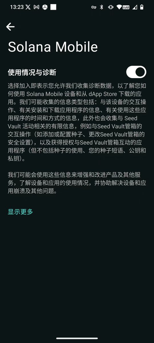 1. 在手机主页上拉找到“设置”-Solana Mobile-打开“使用情况与诊断”,这将允许的Seeker衡量三个活动类别的参与度。