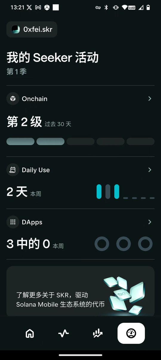 Solana手机/SEEKER @solanamobile 刚刚上线SEEKER活动追踪面板,该面板显示了你的SEEKER手机活跃情况,同时暗示活跃等级会与即将到来的 $SKR 空投挂钩。