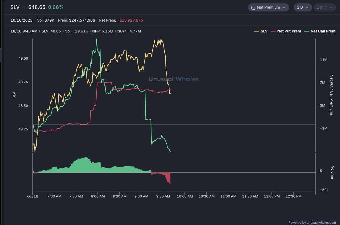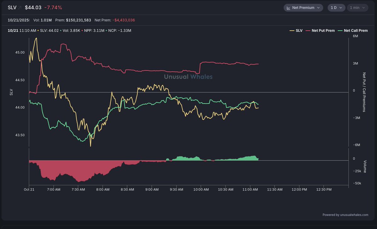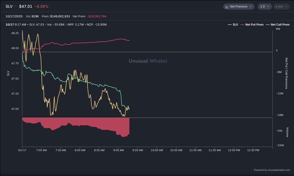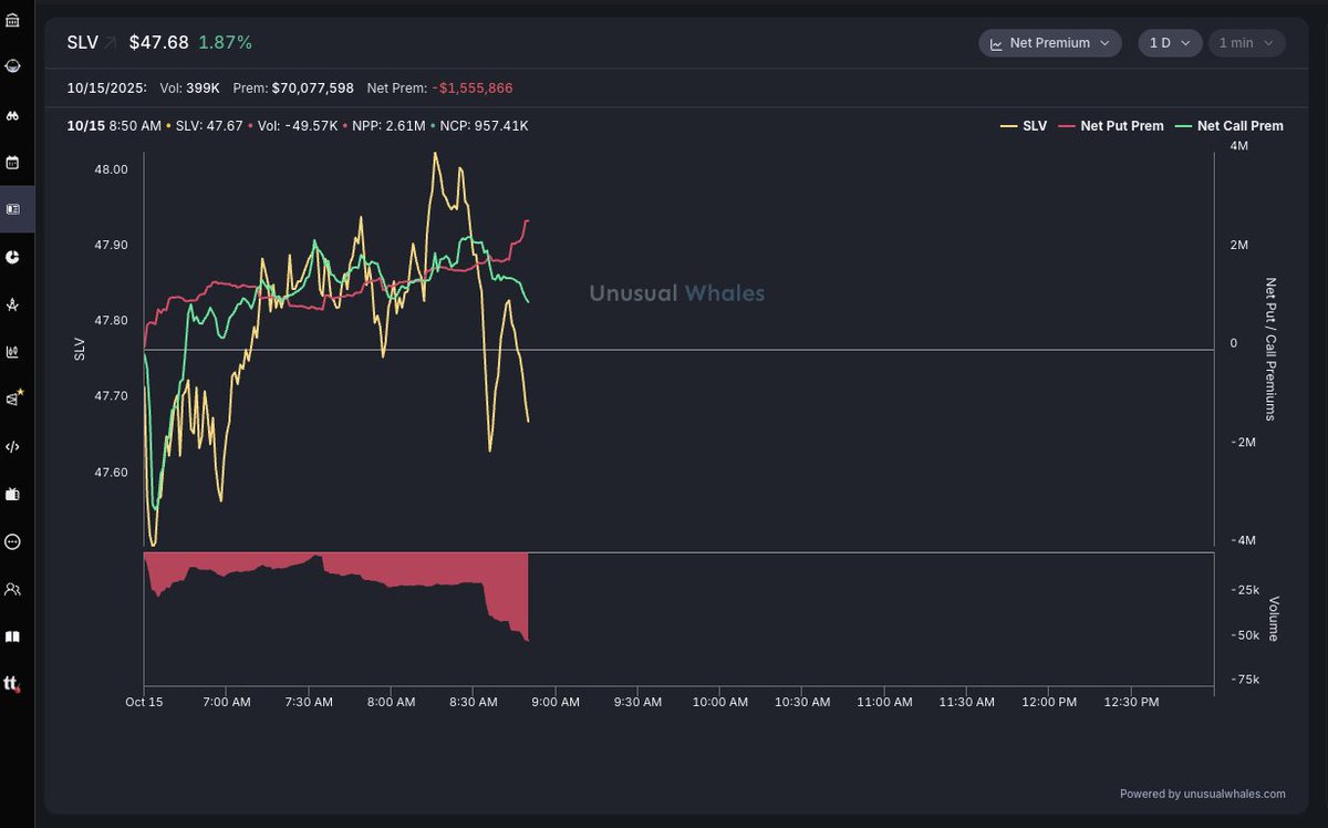 白银 (SLV) 今天下跌超过 7%。 查看 Unusual Whales 的净看涨期权溢价: