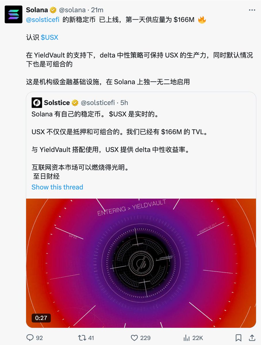 Solstice [@solsticefi] 是一个基于 Solana 的 DeFi 协议,正在开发具有收益特性和跨链互操作性的合成稳定币 $USX。