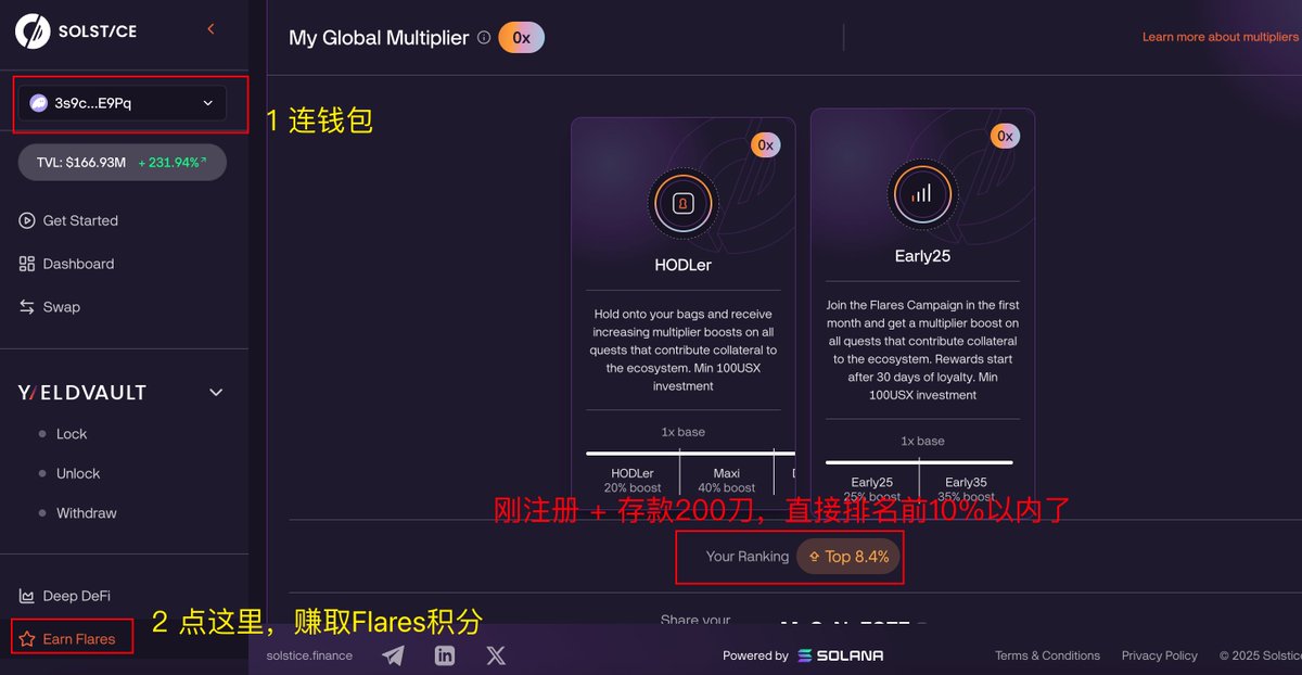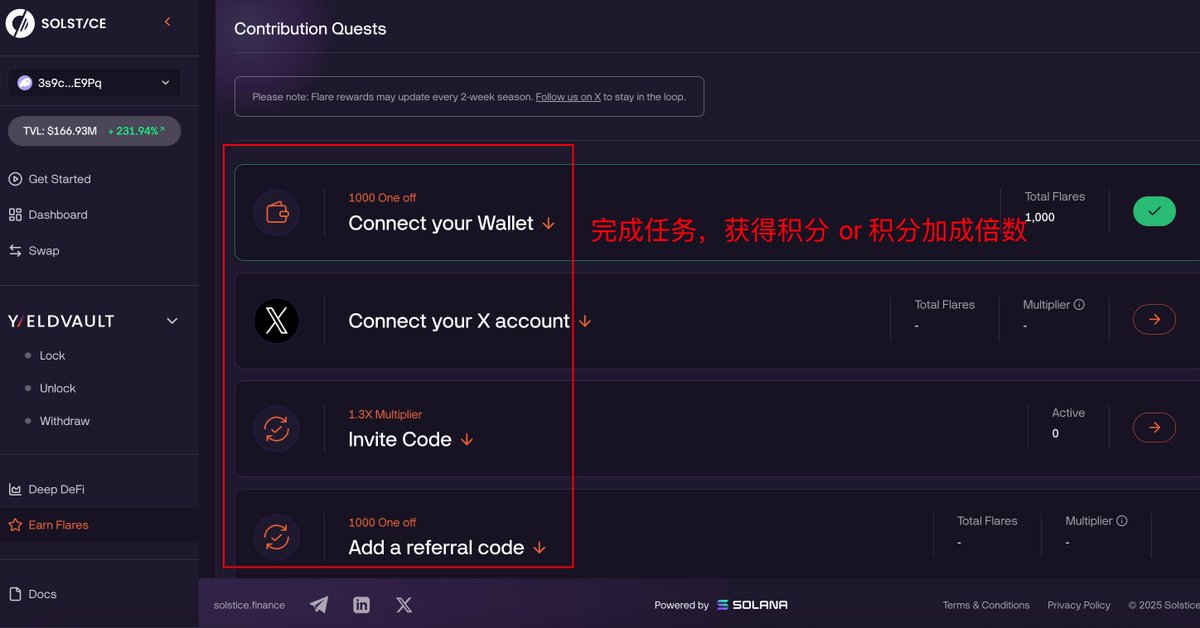 参与者将在 Solstice dApp 中获得 Flares(积分),为上线时赢得早期优势。原生治理代币 $SLX 也将很快推出。
