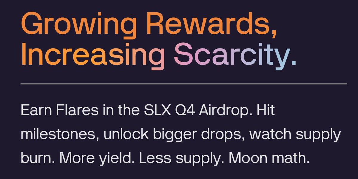 特色是Flares 空投系统:7.5% $SLX 代币(原生治理币)分配给持有/LP/社交任务,10x 倍增(LP 可达)。TVL 越高,奖励越多。