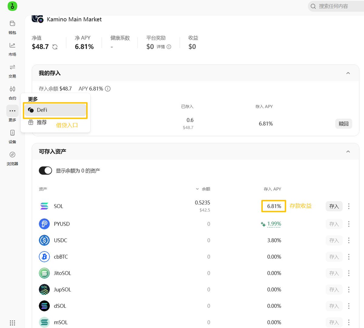 第三步:进入借币页面,存入 SOL,可吃到年化 6.82%的 APY 收益。