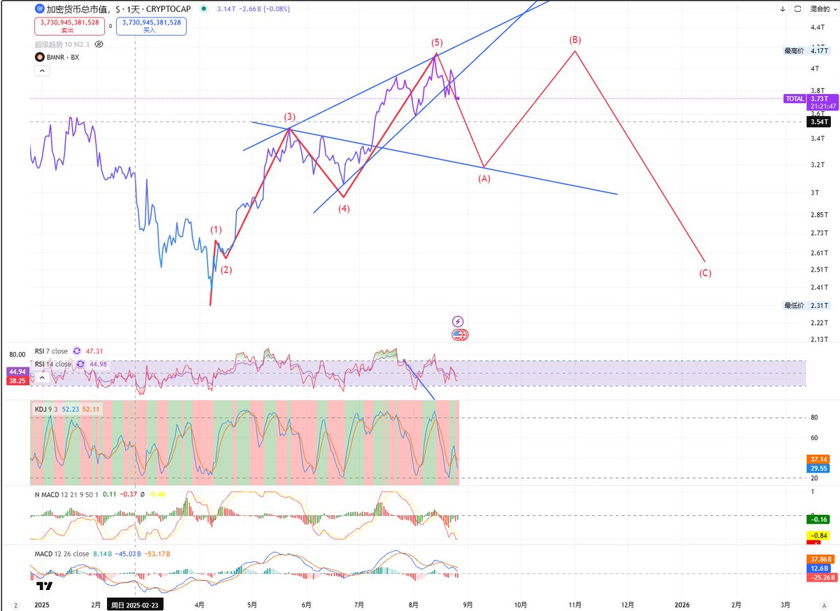 这是我去年 8月26日 发的推特,当时精准的预判了,总市值会砸到 2.5T 以下,彼时很多人还做着 $BTC 20W, $ETH 10000 的梦。从 7 月开始我就一直在警示社区,熊市到了,不要想那么多。不要大仓位持有,最多波段和撸毛。我在朋友圈也发过警示大饼跌破 70000 的预警,那时候币价还是 110000 。