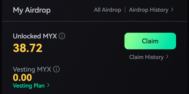 MYX的空投还有最后一期记得领取 链接: 强制锁仓六个月(后三期大毛) 单号起码都是几百u的大毛 前三期基本上价格不理想 后三期价格都起飞涨起来了 perp还有机会期待搞搞