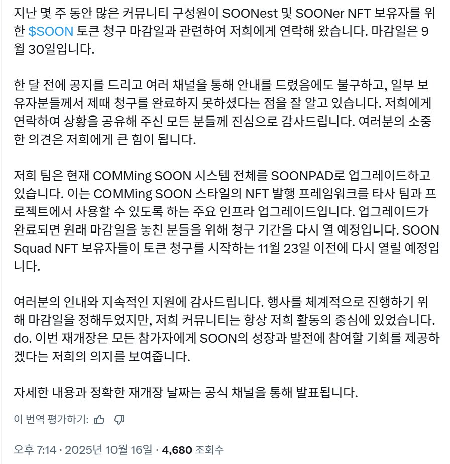 计划于 11 月 23 日之前重新开放,届时 Soon Squad NFT 持有者开始领取,具体日期将另行公布。