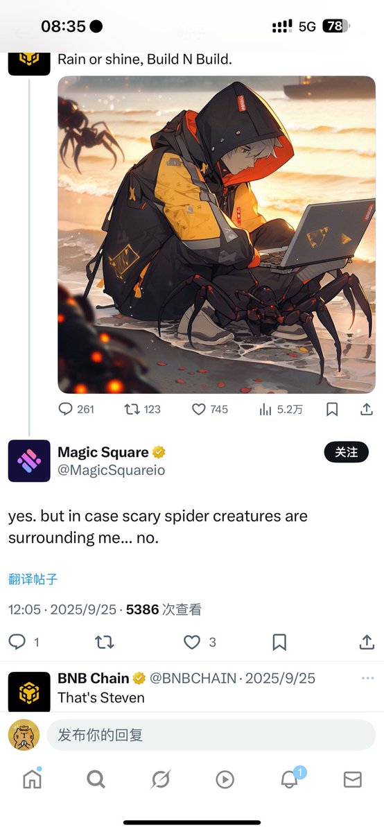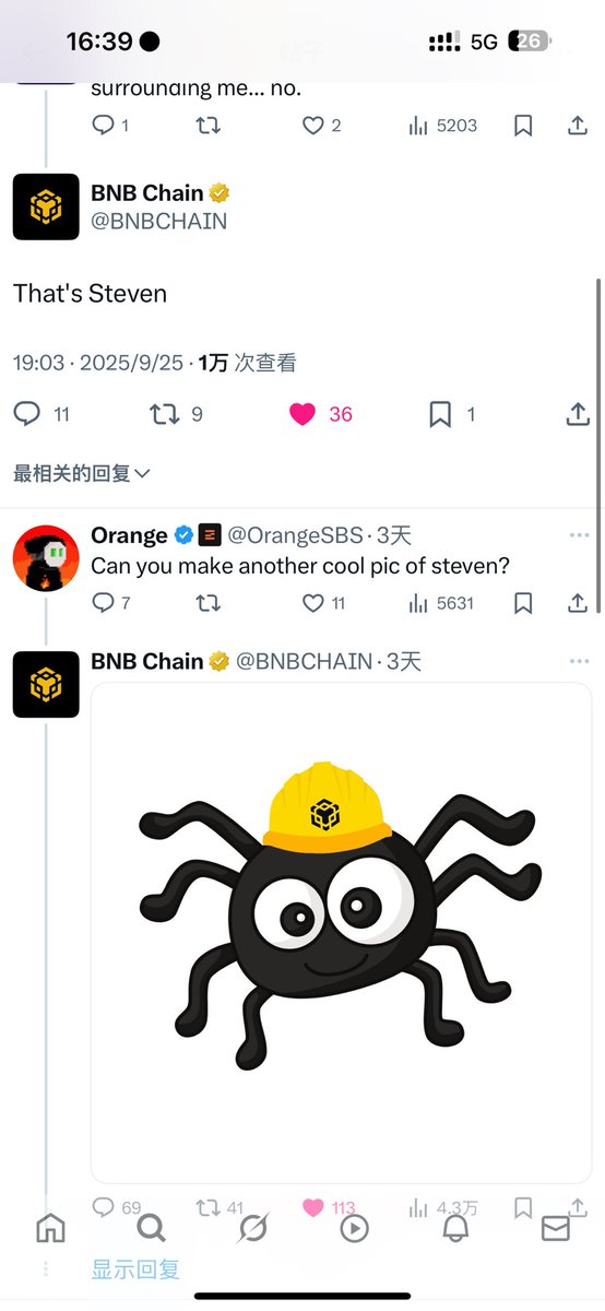 Cz宠物名字不知道真假 但是我知道steven这个小蜘蛛🕷️形象是币安员工在无意间创造出来的,在bsc上总不能一直盯着一姐@heyibinance 还有@cz_binance 表哥吧😂我相信他们也不想看到这样。 总之我认为一个好的生态是允许并且支持百花齐放的!🕸️ 蜘蛛是终极建造者,象征我们用户共同编织币安生态。币安的这一张网需要更多的小蜘蛛来编造!所以加入进来吧兄弟们! 加油币安,加油BSC!