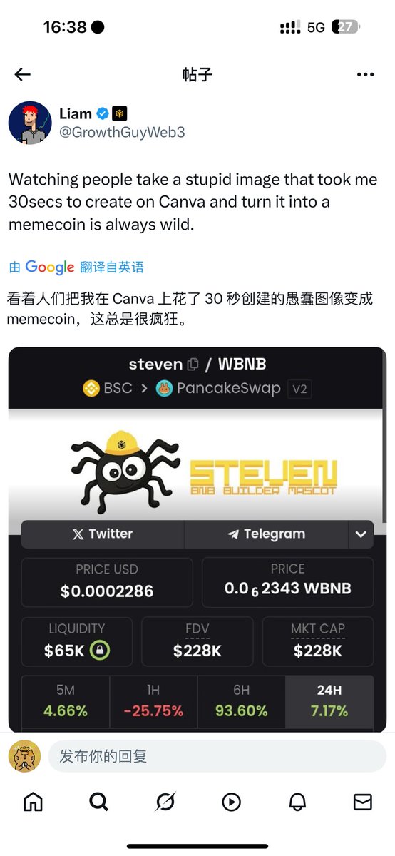 我比较喜欢的一个叙事,之前买了一直拿着 币安官方唯一命名的meme名字,经常发这个蜘蛛图片 还有CZ在某个采访中说过他人生的第一个宠物是一只蜘蛛🕷️ 或许有天官方会解释steven灵感来源于CZ人生中第一个宠物 现在中文角度满天飞,但是我选择相信叙事审美 $steven 0xd67dcc206c79ac0dc535d6afbfaa16ed70d44444