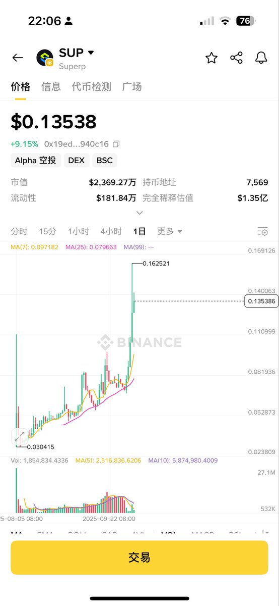 我去研究了下,目前Superp的市值73M,8月刚上线的Perps,已经上线了币安Alpha,bitget最近最近24小时的交易量也非常大,最近也差不多涨了30%,如果持续这个交易,是个信号!